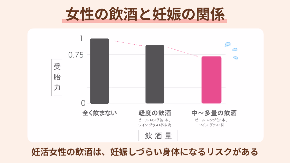 海外の大規模な研究では、「全くお酒を飲まない女性」と比較して、「軽度の飲酒(1日あたり12.5g未満のエタノール摂取)」でも受胎力(妊娠できる能力)が11%低下し、「中程度から多量の飲酒(1日あたり12.5g以上)」では、受胎力が23%も低下するという結果が出ています(※1)。