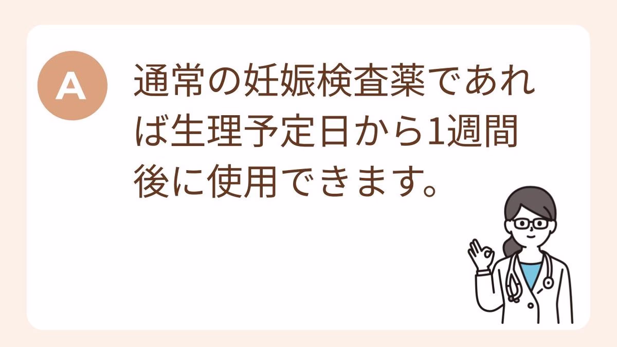 A:通常の妊娠検査薬であれば生理予定日から1週間後に使用できます。