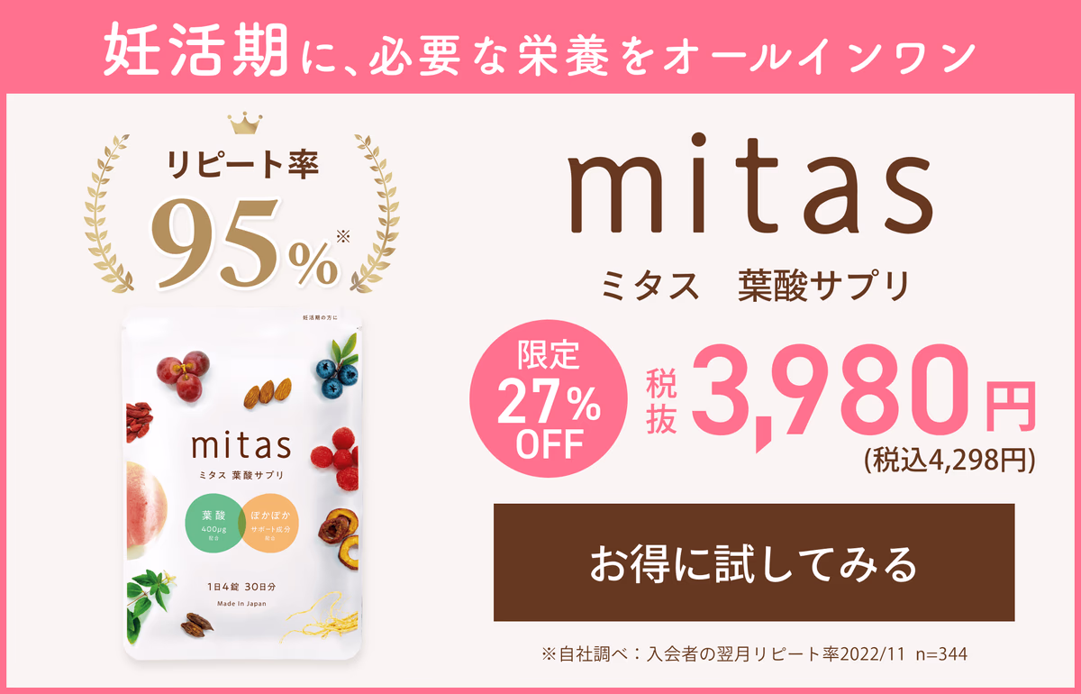 もし、症状をチェックして妊娠ではなさそうと思った方は妊活用サプリメント『mitas』がおすすめです。