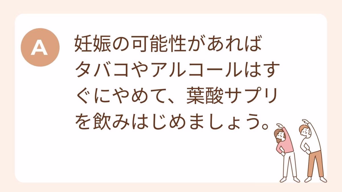 A:妊娠の可能性があればタバコやアルコールはすぐにやめて、葉酸サプリを飲みはじめましょう。