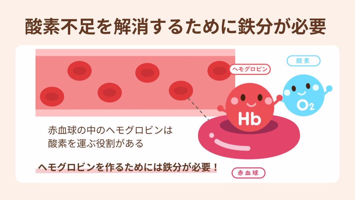 鉄分はヘモグロビンを作るために必要な栄養素。酸素不足を解消するために、鉄分の必要量が大きく増えることから、ママの体は鉄分不足になりやすいのです。