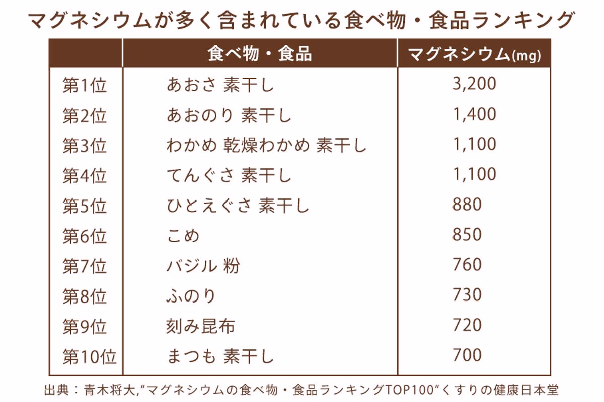 青木将大, “マグネシウムの食べ物・食品ランキングTOP100”くすりの健康日本堂