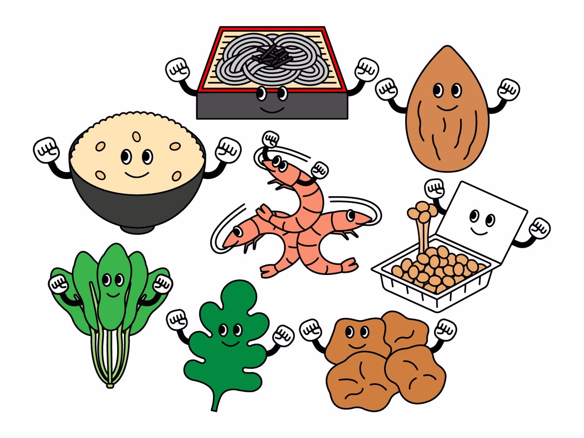 | カルシウム | 牛乳、ヨーグルト、チーズ(乳製品全般)、小魚(ししゃも・いわしの丸干し・煮干し)、小松菜・水菜・チンゲン菜などの青菜、豆腐・納豆などの大豆製品、干しエビ・ひじき |