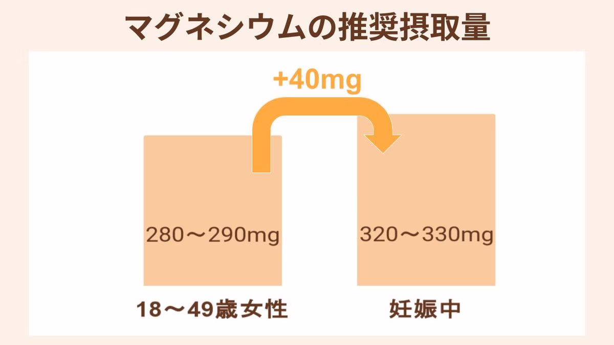 厚生労働省によると、妊娠中に必要なマグネシウムの推奨摂取量は1日あたり「320〜330mg」です。