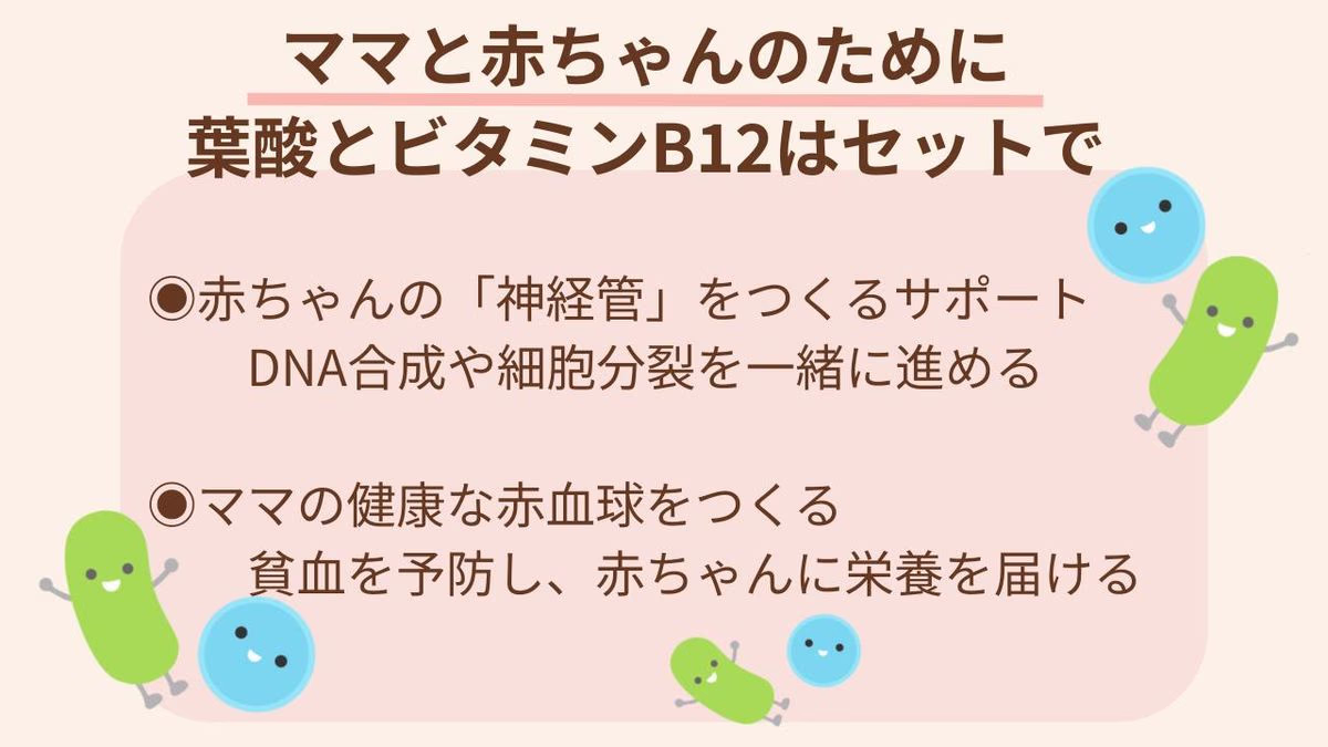 ビタミンB12は、いわば葉酸の「最高の相棒」、体内では常にセットで働く栄養素です。