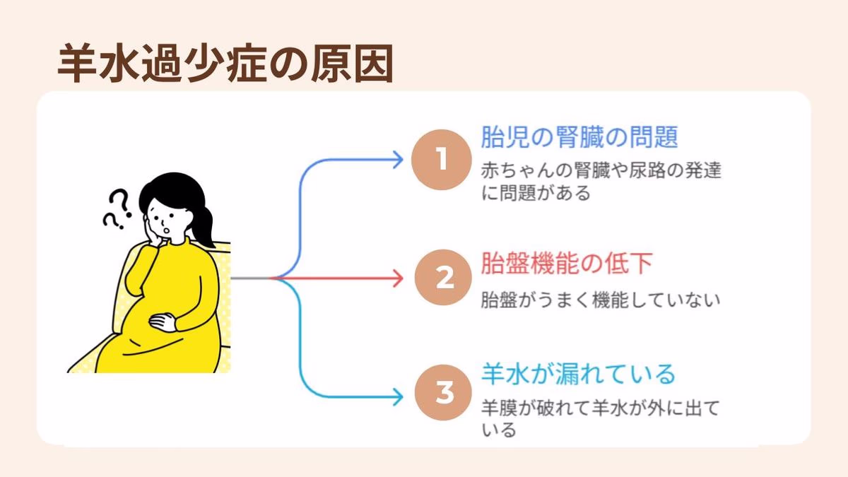羊水過少症は、赤ちゃんの体の機能や、胎盤がうまく働かなくなることで起こります。