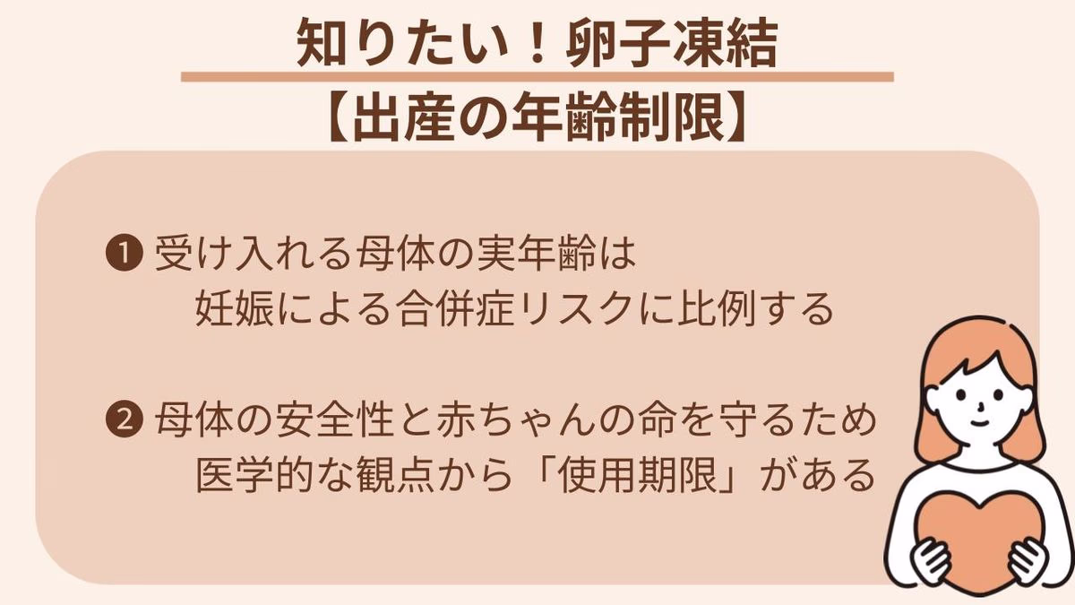 「40歳までに凍結しておけば、何歳でも産める」というわけではありません。凍結卵子を子宮に戻し、妊娠を目指す「使用年齢」にも目安があります。