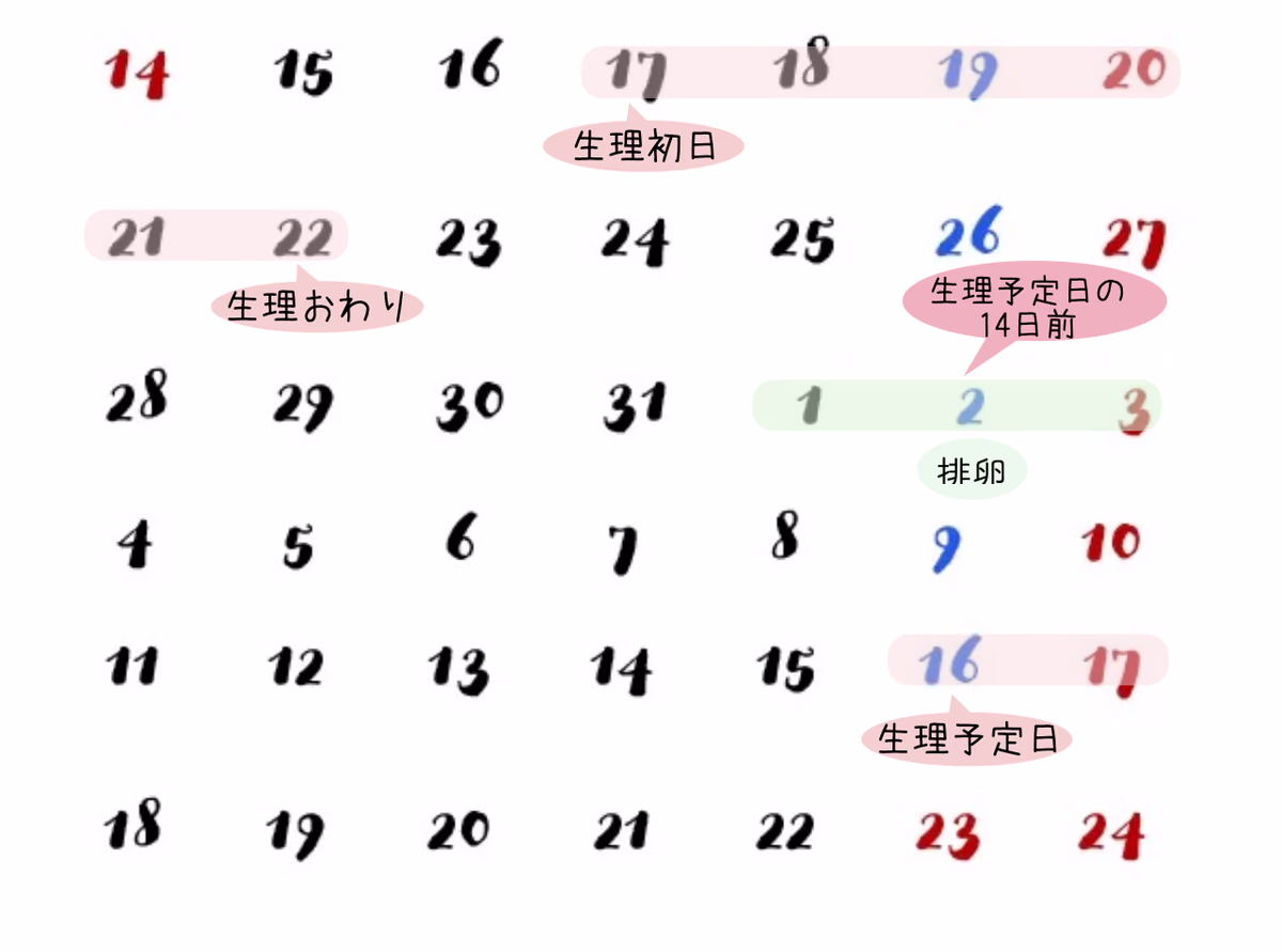 28日周期の場合は「生理が始まってから約14日目」、30日周期なら「生理が始まってから約16日後」が排卵日と予測することができます。