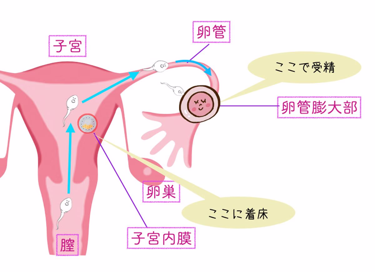 卵子は卵管を通って移動し、その間に精子と出会い受精が成立します。その後数日かけて子宮に到達し、さらに数日かけて子宮内膜に着床します。