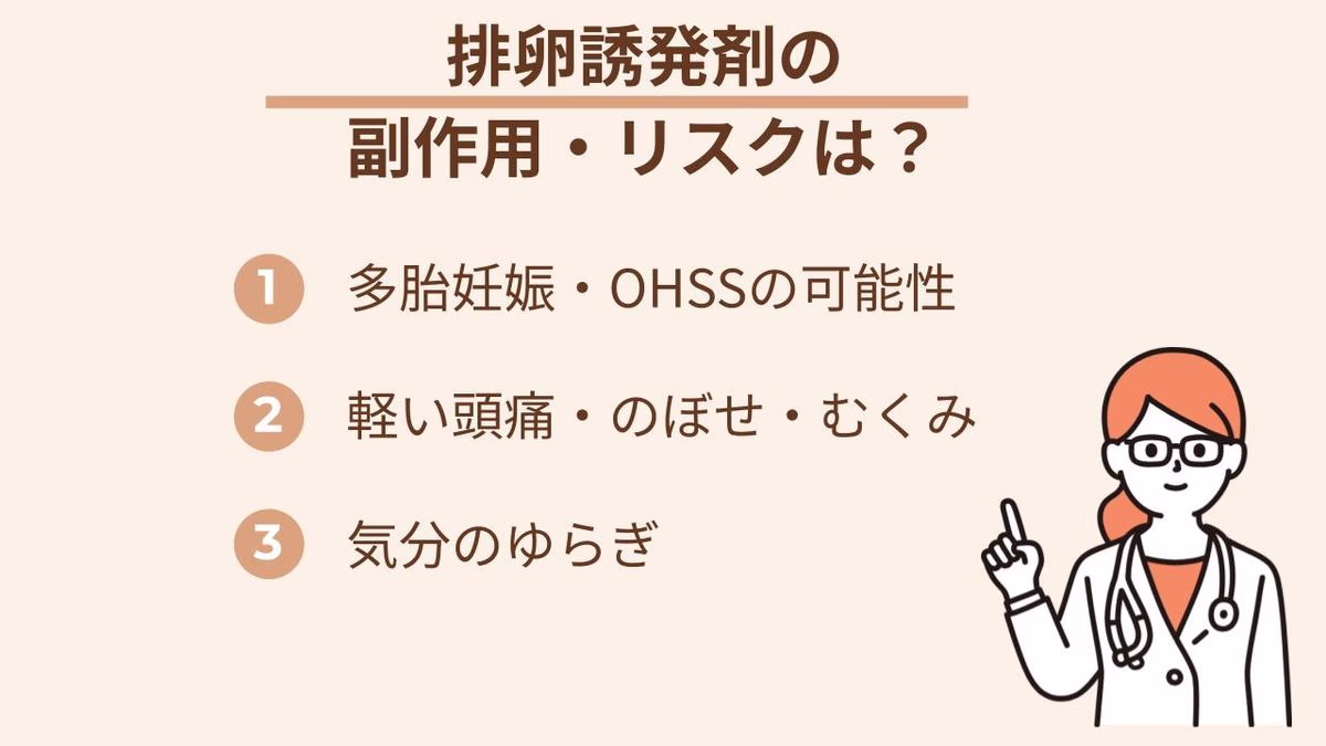 排卵誘発剤は、適切に使えば安全性の高い薬です。ただし、ホルモンの働きを助ける薬のため、体の反応で一時的な副作用が出ることもあります。
