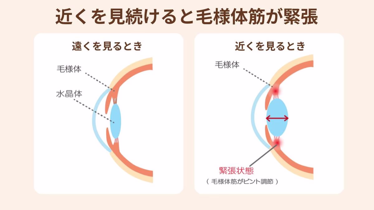 ピントを合わせるために働く「毛様体筋」は、近くを見続けることで緊張し、凝り固まってしまいます。
