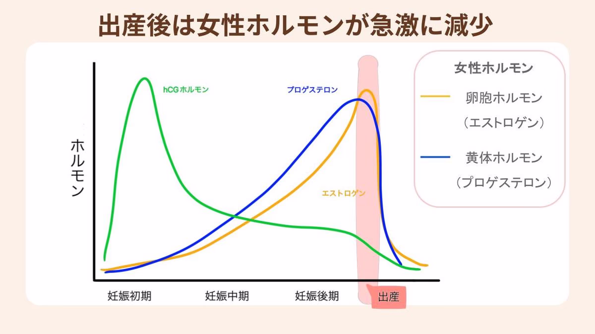 妊娠中は出産に向けて女性ホルモンの分泌が増加しますが、産後は一転して急激に減少します。