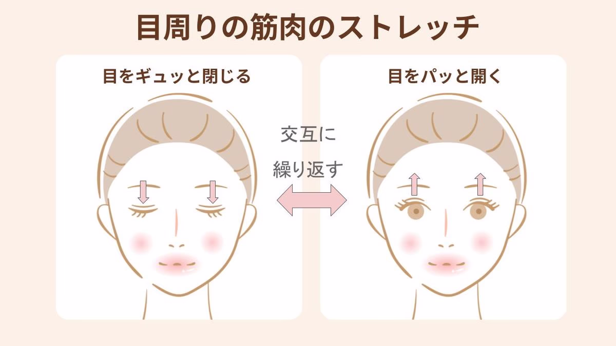 また、ギュッと目を閉じてパッと開いたり、交互にウインクしたりといった動きも、目の周りの筋肉のストレッチになり、疲れ目のケアに効果的です。