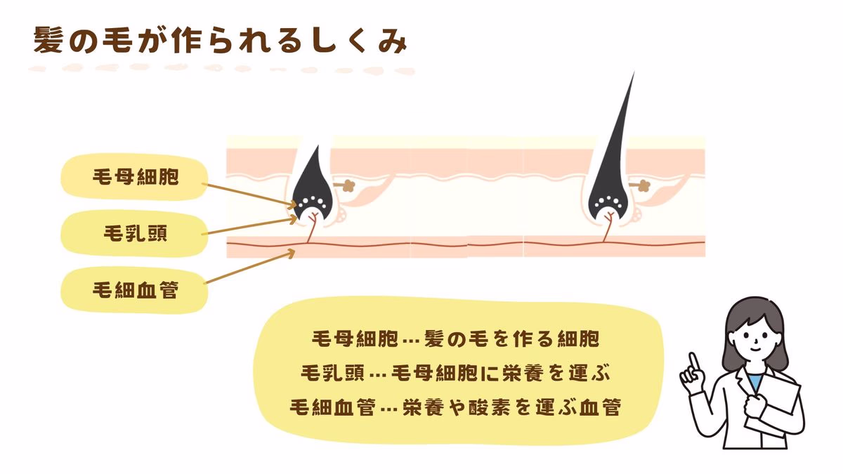 髪の毛を作る毛母細胞は頭皮にあります。そして、毛母細胞に栄養を運ぶのは「毛乳頭」と呼ばれる毛細血管が流れる部分です。そのため、血行が悪いと毛母細胞に栄養が送られません。