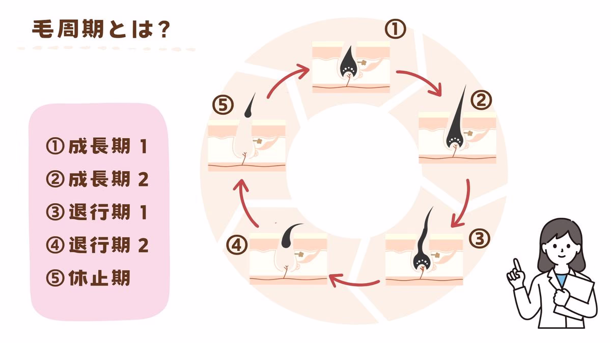 - 休止期:新しい毛が生える準備のため、脱毛が起こる時期