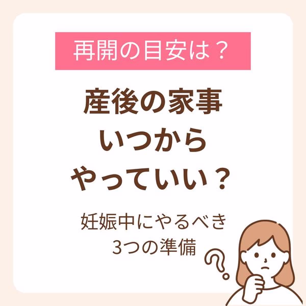 産後はしばらく休むことが理想ですが、現実的には2カ月間まったく家事をしないのは難しいという方も多いでしょう。実際には、産後3週間頃から少しずつ家事を再開するママが多いようです。
