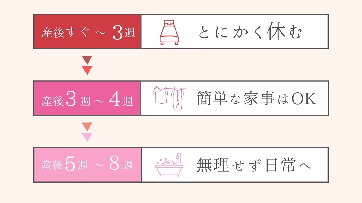 産後は無理をせず、身体の回復に合わせて徐々にもとの生活に戻していきましょう。