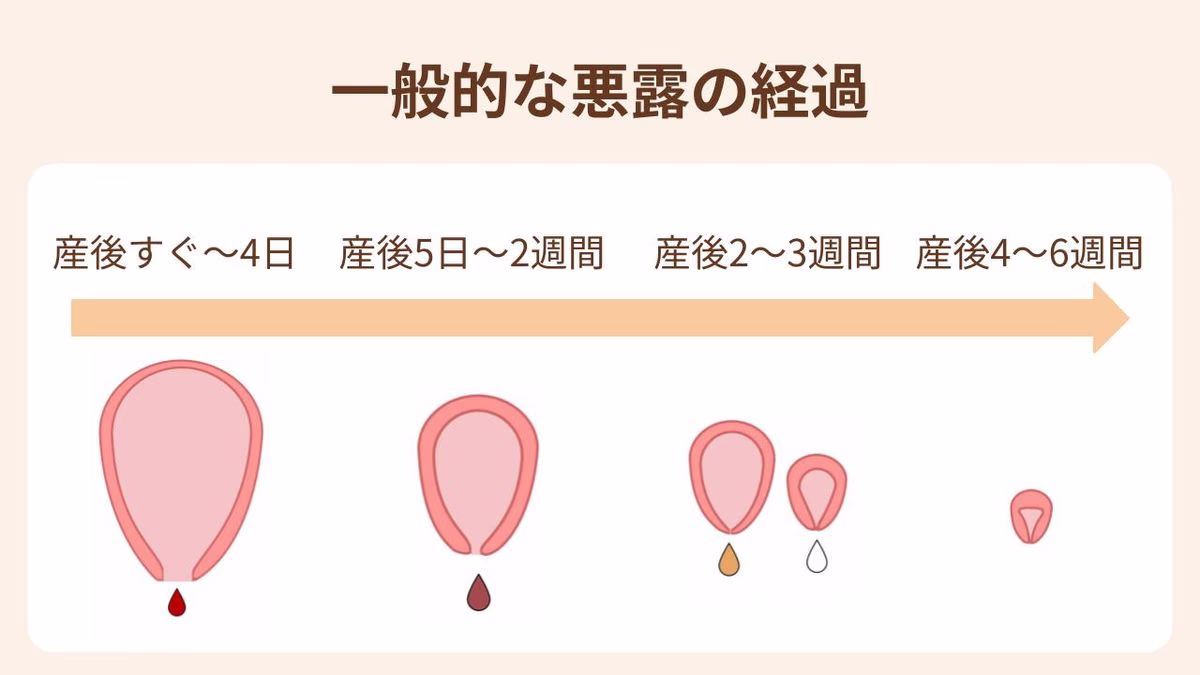 悪露は、出産直後から始まり、色や量を変化させながら1ヶ月ほど続くのが一般的です。