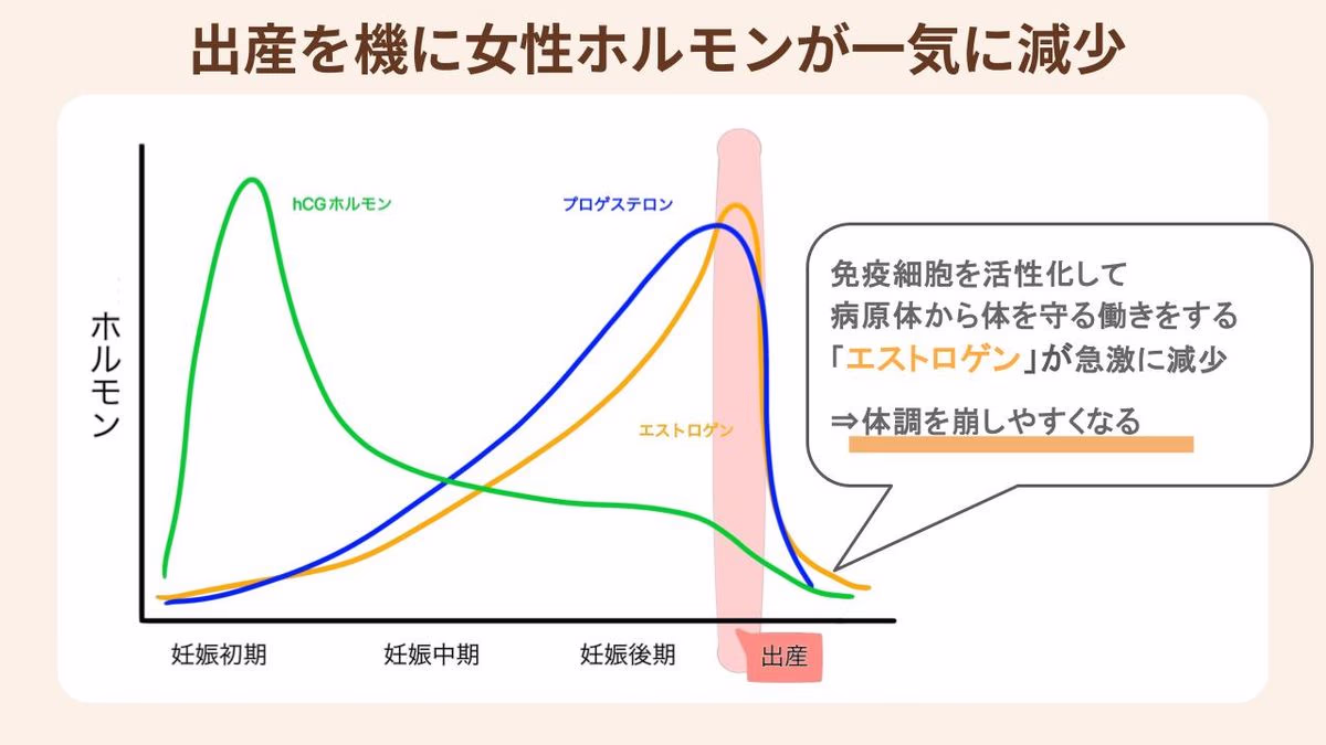 産後はホルモンバランスや生活リズムが大きく変化するため、免疫力が下がりやすい時期です。「この状態はいつまで続くの?」と不安になるママも多いでしょう。