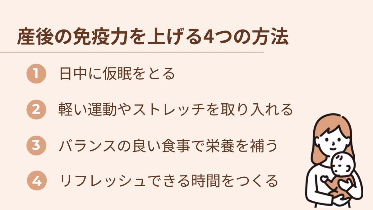 産後の体は、妊娠や出産による大きな変化から回復している途中。そこに赤ちゃんとの新しい生活も加わるため、どうしても免疫力が下がりやすい状況が続きます。
