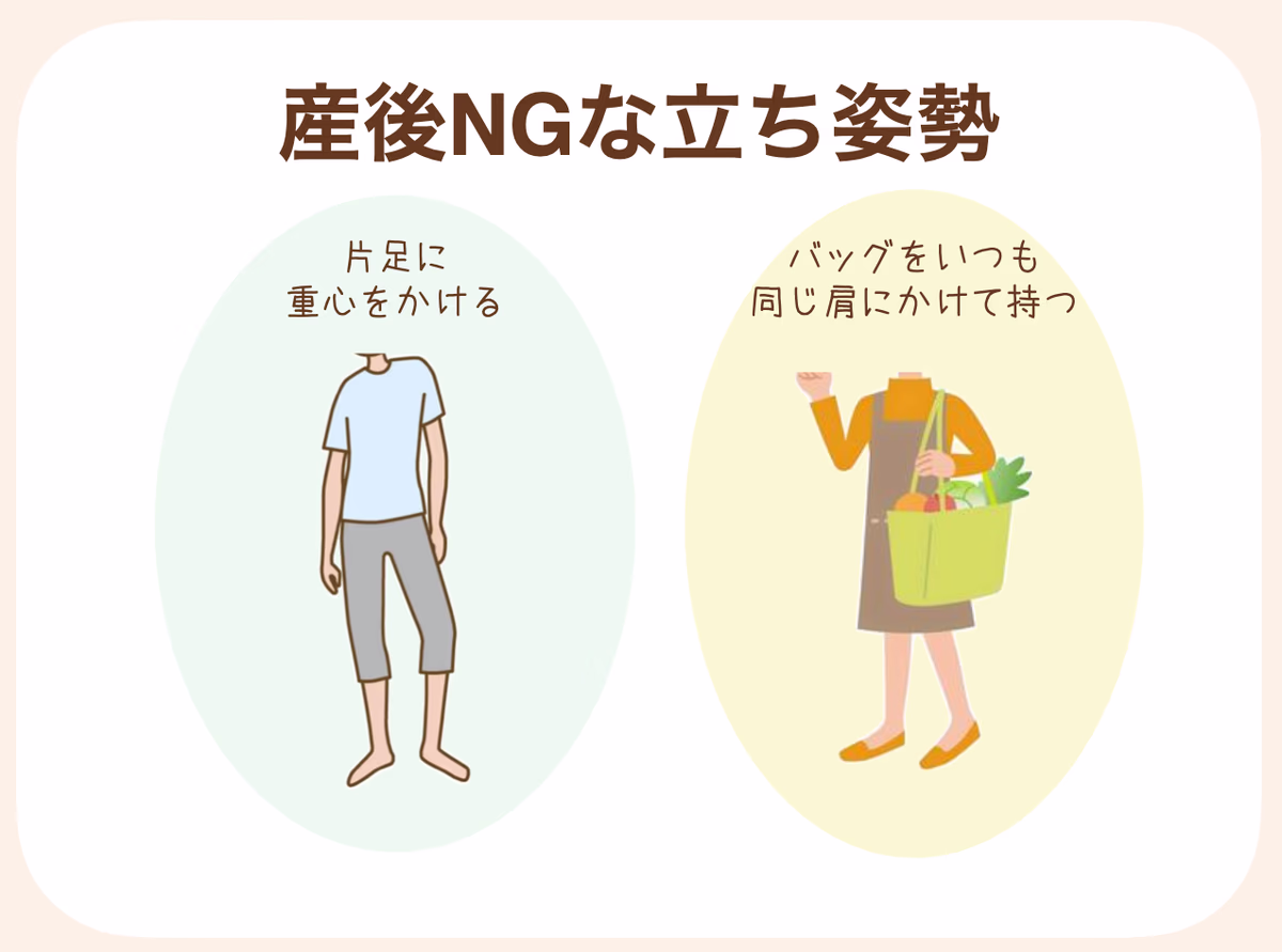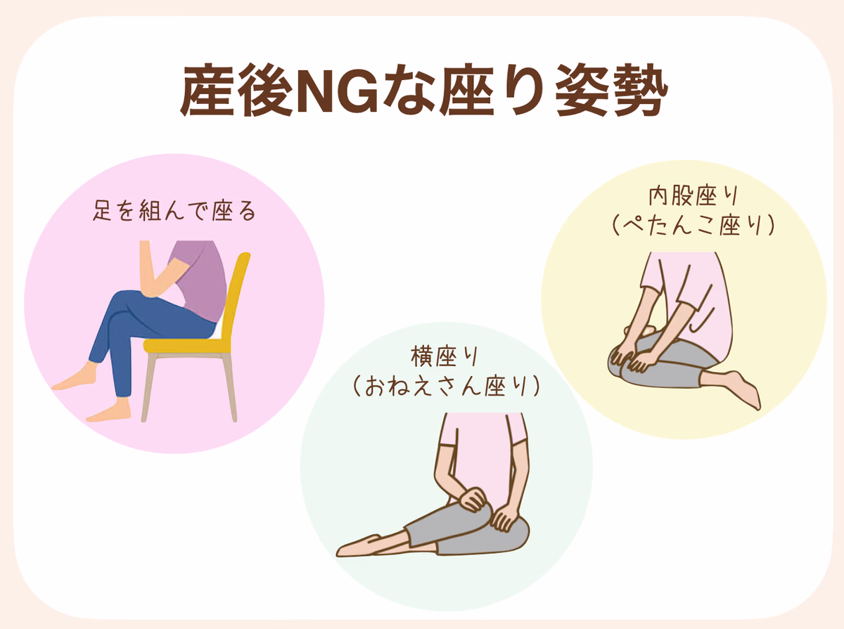 産後は、出産によって開いた骨盤がもとに戻ろうとしている時期です。そのため、骨盤が左右非対称になる姿勢や、骨盤が傾いた状態で負荷がかかる姿勢はNG。