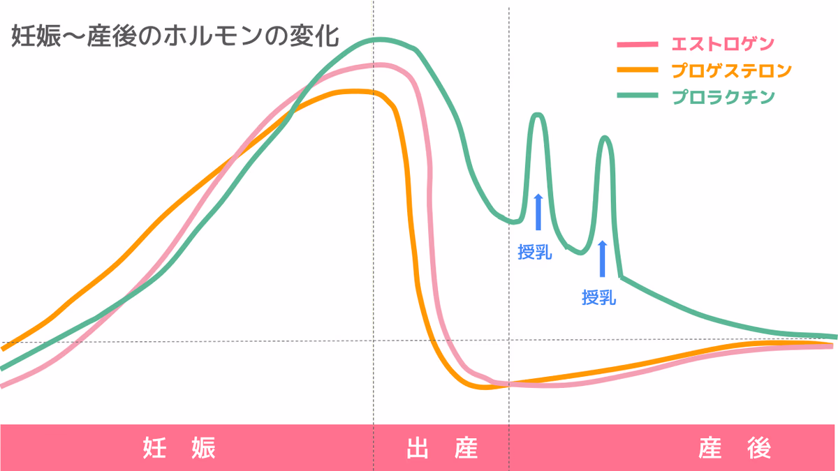 また、産後は母乳の分泌に関わる「プロラクチン」や、子宮の回復や授乳に関与する「オキシトシン」といった新たなホルモンも分泌され始めます。