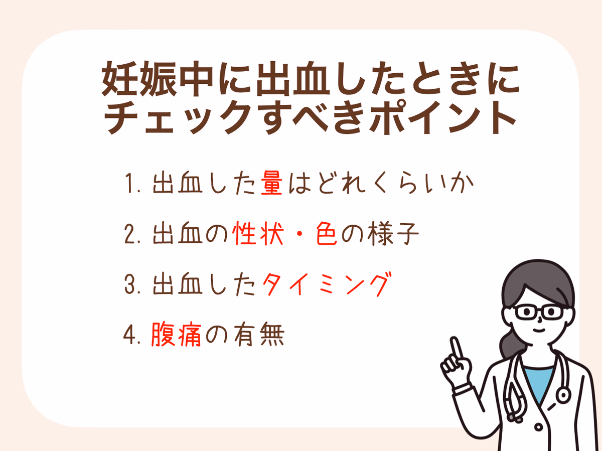 妊娠中に出血したときには、妊娠中のママのカラダや赤ちゃんに影響はあるかなど、出血の原因を知るためにもチェックしておきたいポイントがあります。