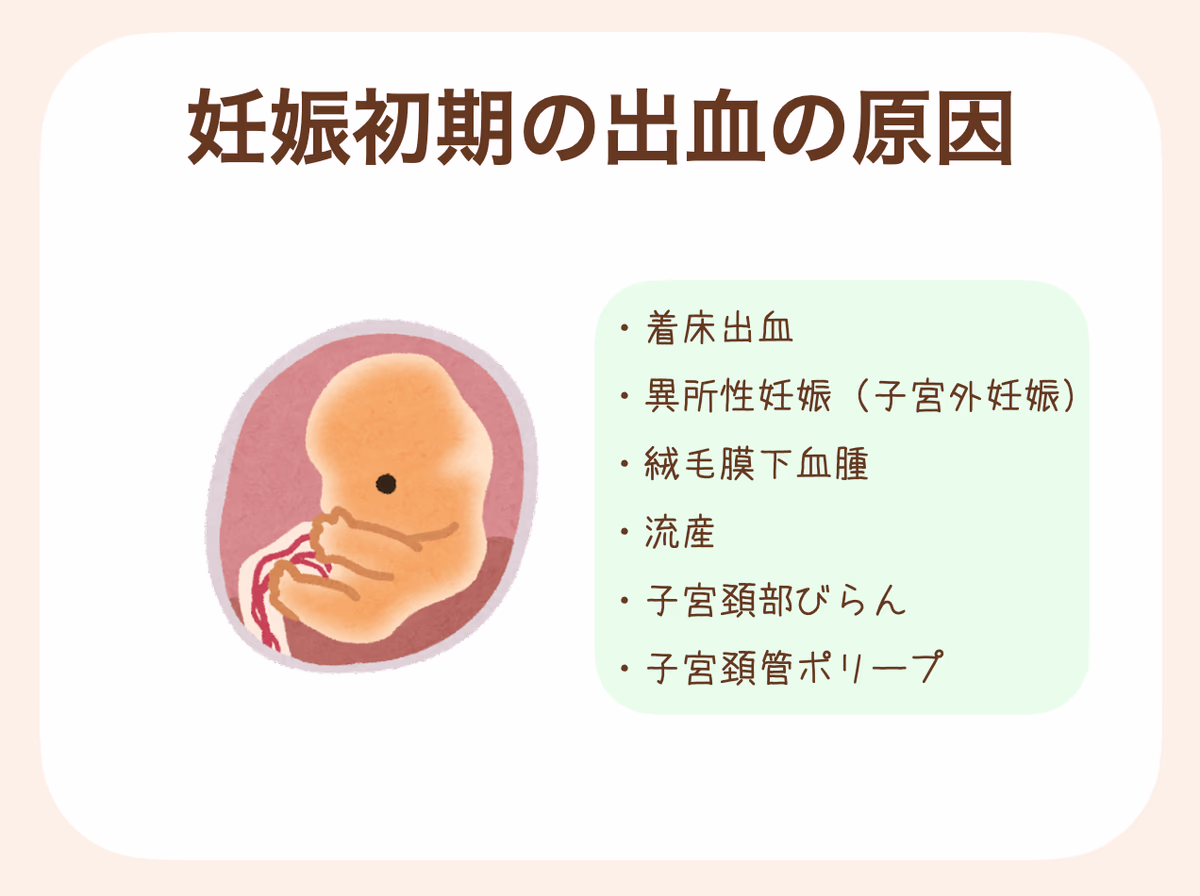 妊娠初期には絨毛膜下血腫、流産、子宮外妊娠などの妊娠中の異常による出血の他にも、着床出血や子宮頚部びらんなど、妊娠に伴って起きるカラダの変化による出血があります。