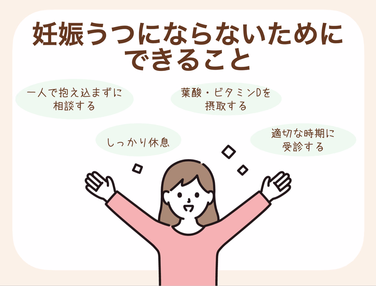 このときに適切に対処することで、妊娠うつを予防することもできます。妊娠うつにならないためにできることの一部を紹介していきます。