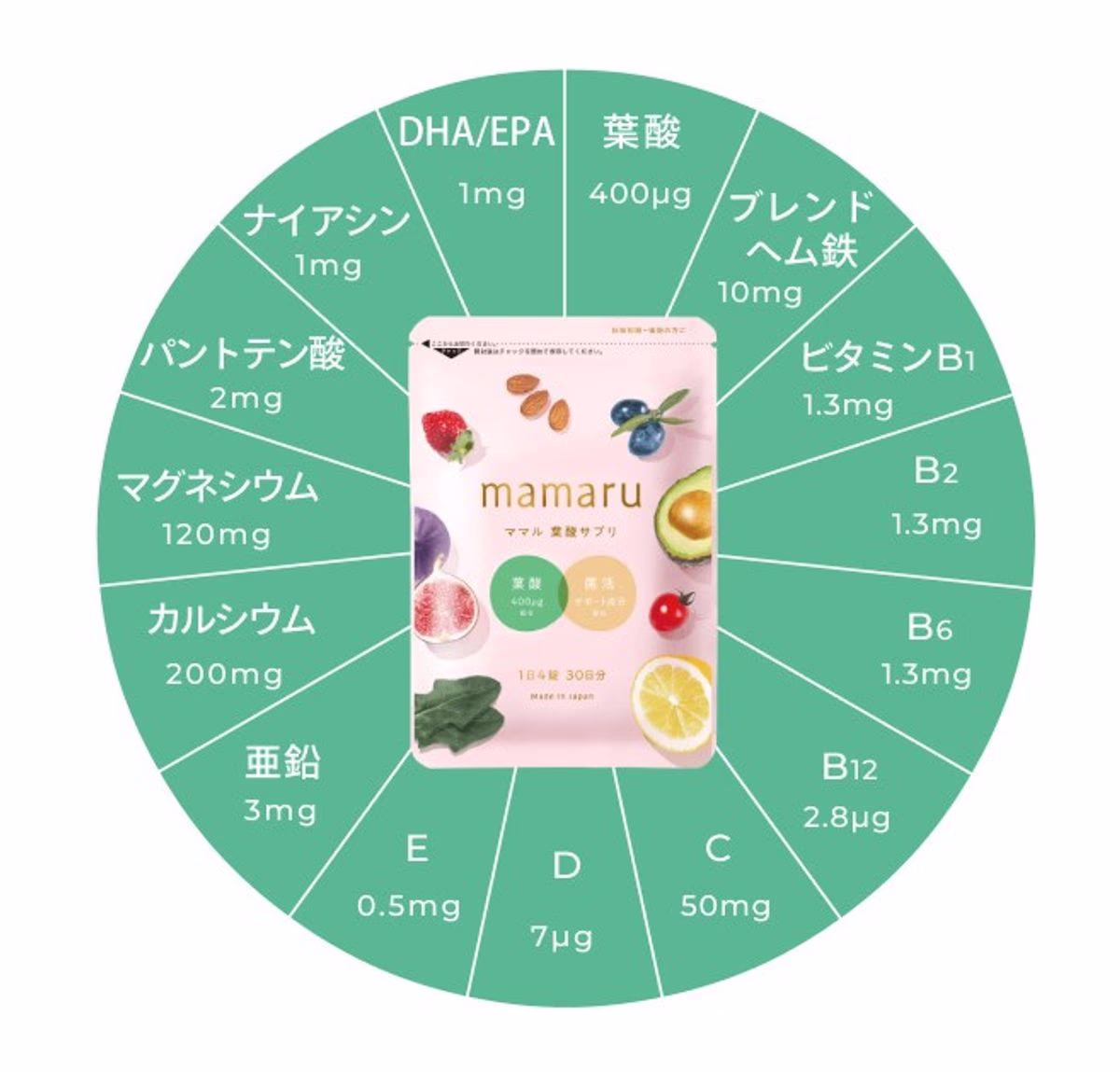mamaruには厚生労働省が推奨している1日400µgの葉酸と、20種類以上の栄養素が配合されています。主な栄養素として、貧血予防のための鉄分や、赤ちゃんの歯や骨を形成するカルシウム、その他妊娠期に特に不足しがちなさまざまなビタミンやミネラルなどが含まれています。