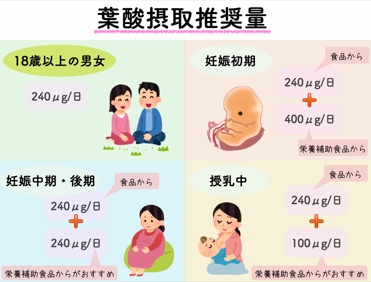 上で説明したように、時期によって必要な葉酸の摂取量は変化します。
