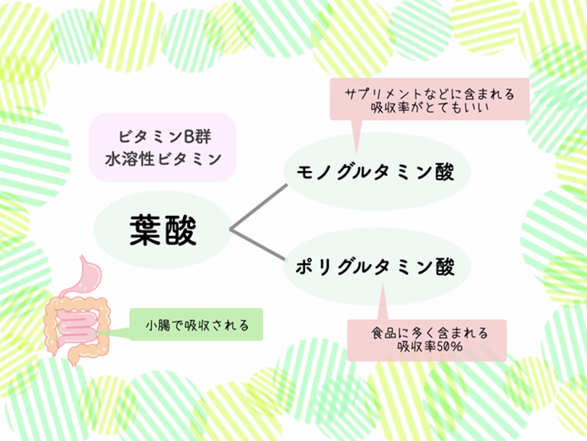 食べ物に含まれる葉酸は「ポリグルタミン酸型葉酸」、サプリメントに含まれる葉酸は「モノグルタミン酸型葉酸」です。
