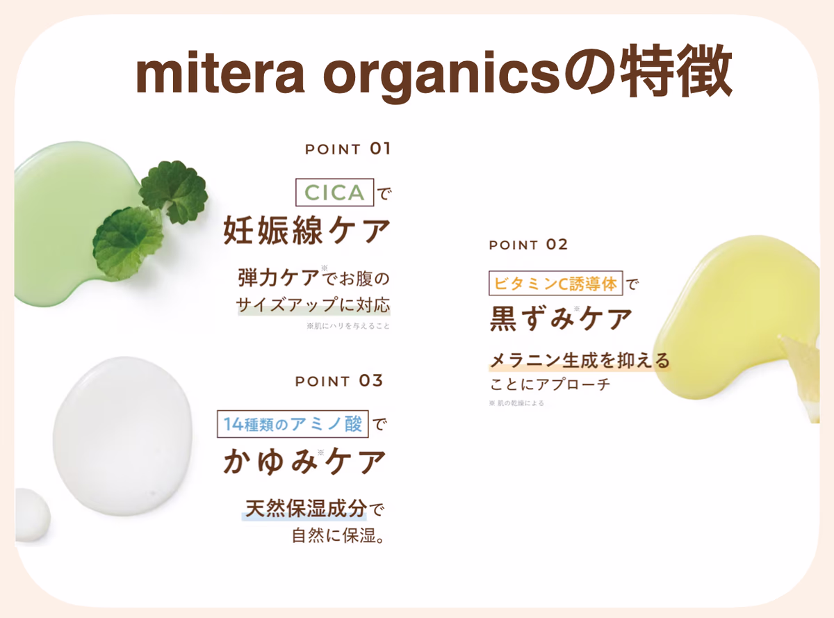 mitera organicsボディケアクリームが体の外側から、mamaruが体の内側から妊娠中のつらいかゆみケアをお手伝いします。