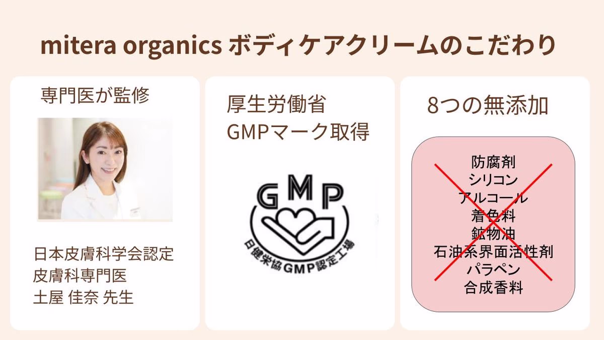 mitera organicsボディケアクリームは、妊娠中の肌悩みをケアする成分を贅沢に使用した、皮膚科医監修の信頼できる保湿クリーム。