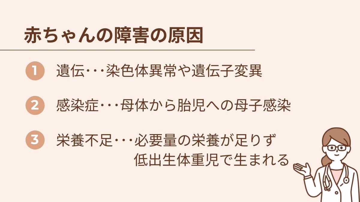 赤ちゃんの障害の原因には、遺伝、感染症、栄養不足などさまざまなものがあります。
