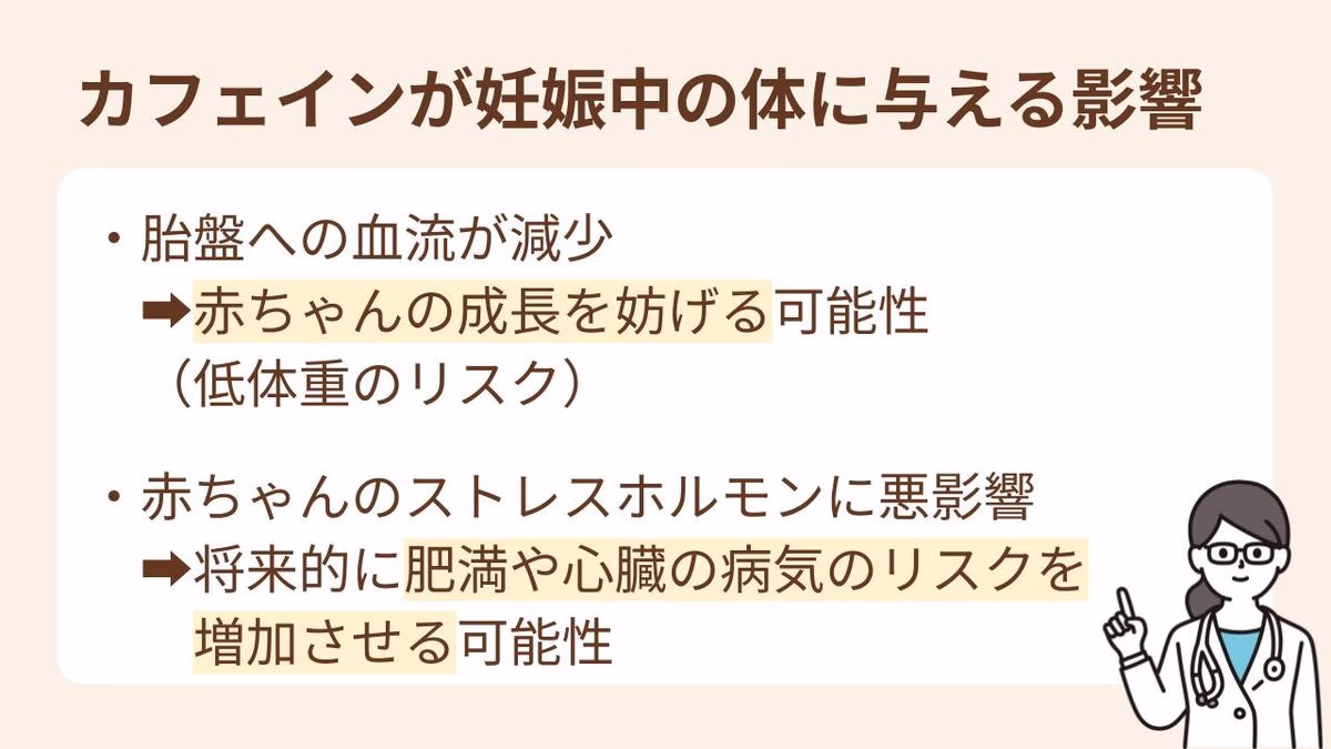 妊娠中にカフェインを摂りすぎてしまった場合には、お母さんだけでなく赤ちゃんにも次のような影響が及ぶことがあります。(※3)