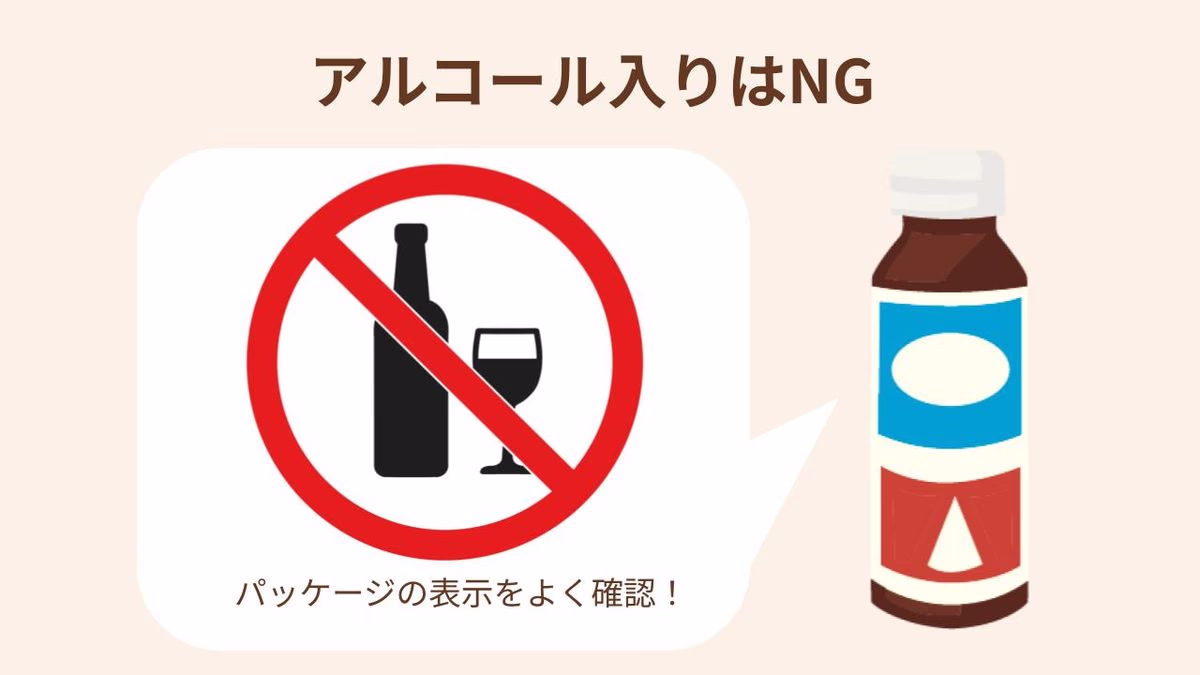 赤ちゃんの発育の遅れや神経系の障害につながる可能性があるため、アルコールが含まれていないか、購入前にパッケージの表示や原材料欄をよく確認しましょう。
