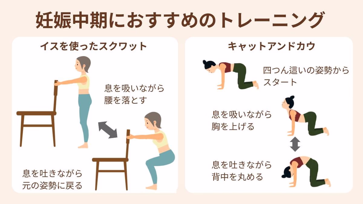 妊娠中期におすすめのメニューは、イスを使った「スクワット」。下半身の筋力アップに効果的で、出産時の体力づくりのためにもおすすめです。