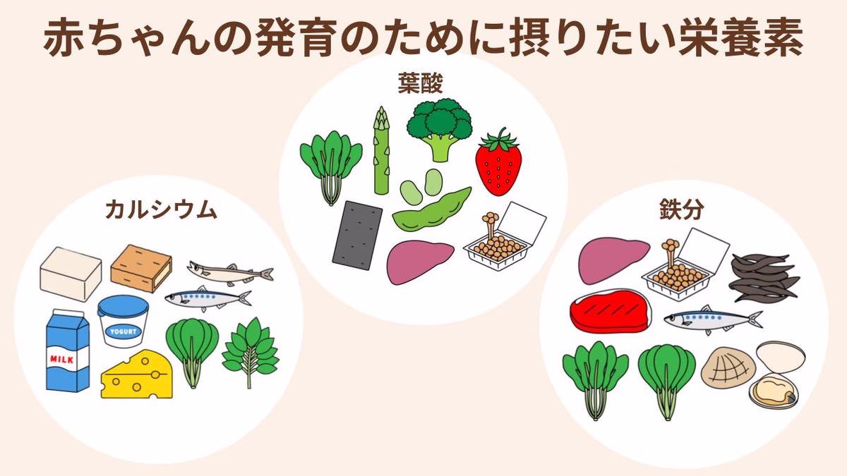 赤ちゃんの発育のために意識して摂取したい栄養素もあります。とくに注目したい栄養素はこちらの3つです。