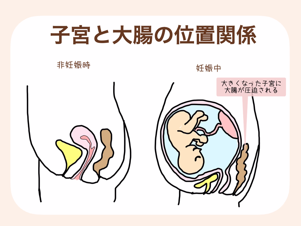 妊娠中に赤ちゃんとともに子宮が大きくなると、大腸は子宮に圧迫されるようになります。