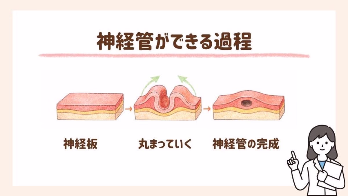 「神経管」は、妊娠に気付くか気づかないかくらいの早い時期に作られる、将来的に赤ちゃんの脳や脊髄の元になる器官。神経管は、元は一枚の板のような状態ですが、最終的に筒状になります。