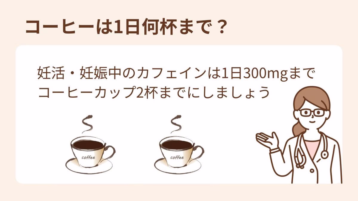 - 妊娠中のカフェインは1日300mg以内(コーヒー2杯程度)に抑える