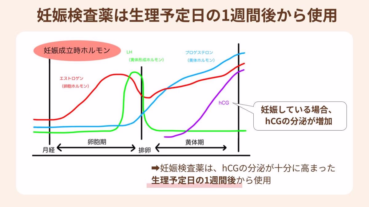 hCGは着床の直後から少しずつ増えていきますが、生理予定日から1週間ほど経つ頃には分泌量が十分に高まり、検査薬でも判定しやすい状態に。そのため、生理予定日の1週間後が正確に判定できる、検査に適したタイミングとされています。