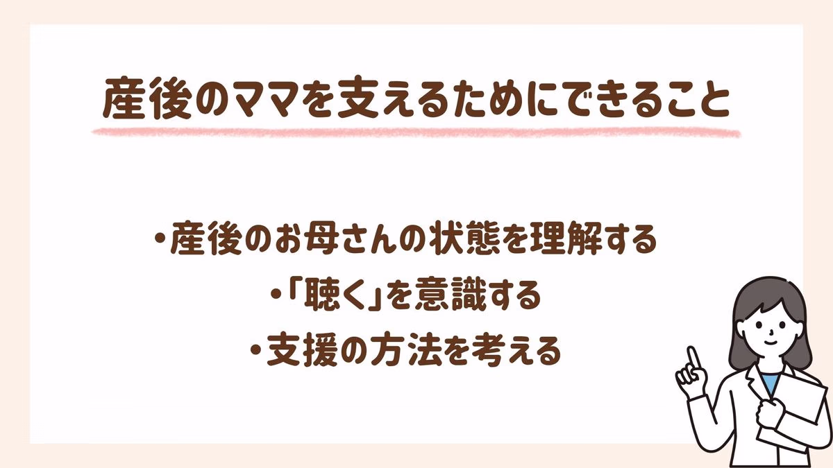 最後は、家族に読んでほしい、産後のお母さんを支えるために大切なことを3つのポイントで紹介します。