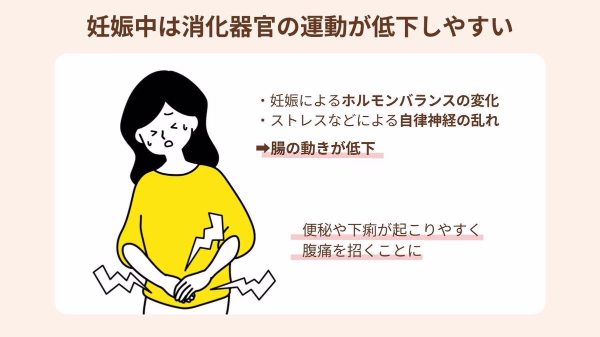 妊娠中は黄体ホルモン(プロゲステロン)の分泌が増える影響で、腸の動きがゆるやかになりがち。さらに、冷えや疲れ、ストレスなどで自律神経のバランスが乱れると、腸の動きがより低下してしまうことに。