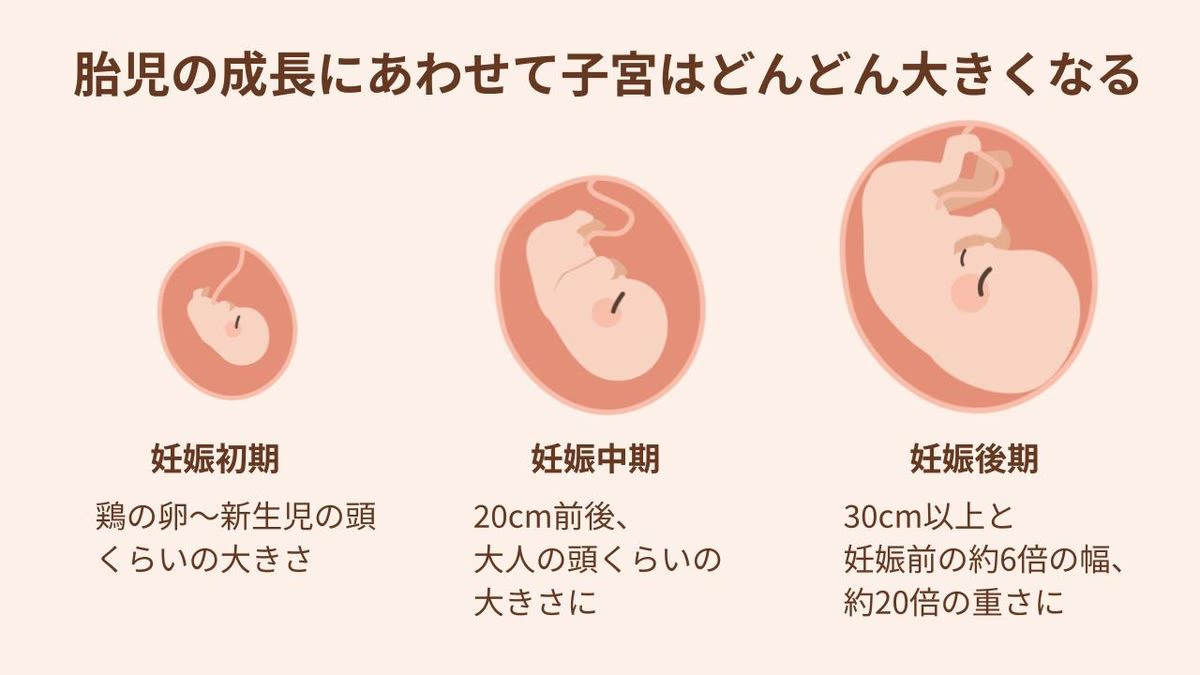 妊娠経過が進むにつれて、赤ちゃんの成長にあわせて子宮はどんどん大きくなります。妊娠前は鶏の卵ほどの大きさだった子宮が、中期には約20cmと大人の頭ほどに。さらに、後期には30cm以上にまで成長します。