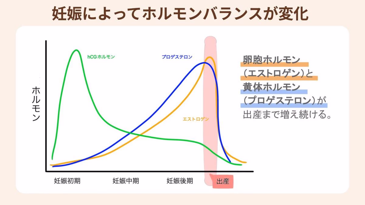 妊娠すると卵胞ホルモンと黄体ホルモンという2つの女性ホルモンの分泌が急増し、出産まで増え続けます。