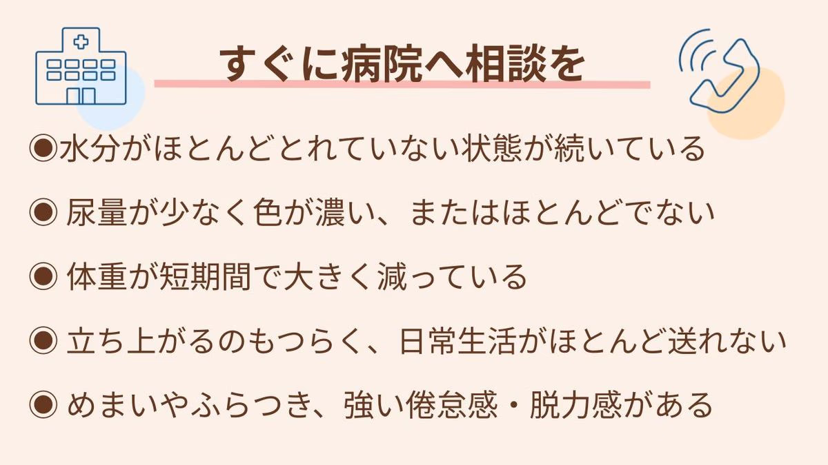 これらは、体が脱水や栄養不足を起こしているサインです。早めに医療機関での処置を受けることで、症状の悪化を防げることがあります。