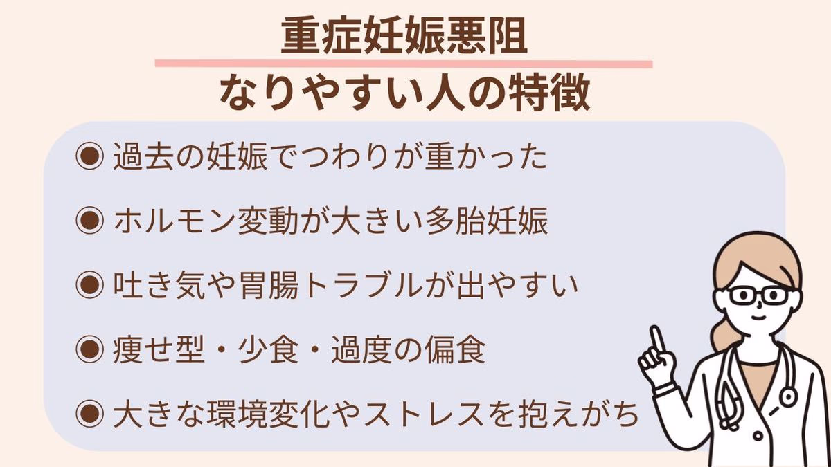 重症妊娠悪阻に「なりやすい人」と聞くと不安になるかもしれませんが、あらかじめ傾向を知っておくことで、早めの対処や受診につなげやすくなります。