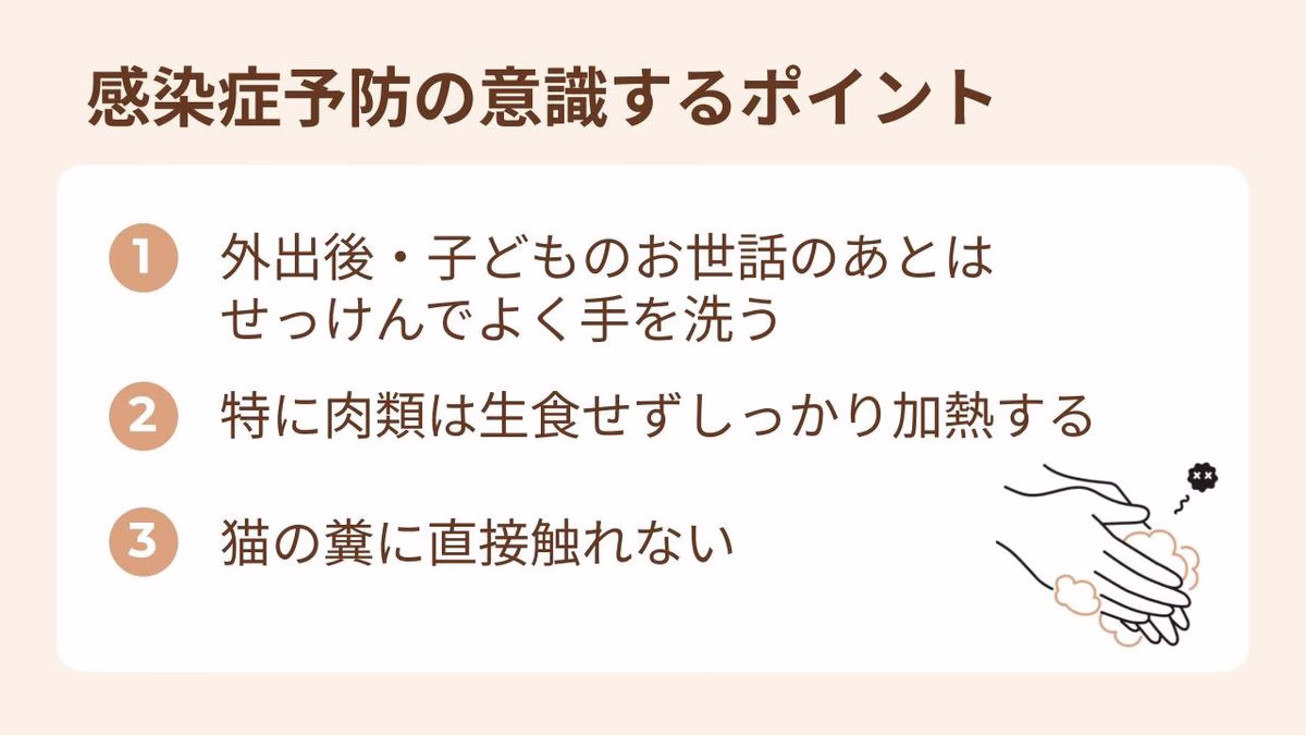 トキソプラズマ原虫は猫の糞にも存在する場合があるので、猫を飼っている方はトイレの処理に注意してください。手袋やマスクをして処理をし、終了後は手洗いと消毒を徹底しましょう。